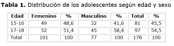 Se realizó un muestreo aleatorio estratificado. La muestra quedó constituida por 178 adolescentes: 60 de décimo grado, 29 de undécimo y 89 de duodécimo.