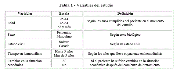Fueron incluidos un total de 69 pacientes, 45 varones y 24 mujeres, con edades (cumplidas en el momento del estudio) comprendidas entre 25-44 años (24 pacientes), 45-64 (30 pacientes) y más de 65 años (15 pacientes). El estado civil se definió como soltero y casado. Según el tiempo que llevaban en hemodiálisis los pacientes se agruparon en periodo de hasta 5 años y más de 5 años. La situación económica se valoró de acuerdo a si presentó cambios desfavorables en su economía o no, después de comenzar el tratamiento de hemodiálisis. Las variables estudiadas se resumen en la tabla 1.