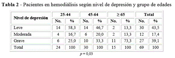 En la tabla 2 se muestran los pacientes estudiados según nivel de depresión y grupo de edades. Puede ser observado que las frecuencias de pacientes con depresión moderada y grave fueron mayores en los que tienen edades entre 45 y 64 años, al ser comparadas con las frecuencias de pacientes con estos mismos niveles de depresión en el grupo de 25 a 44 años de edad. En el caso de los pacientes con edades iguales o mayores a 65 años, la frecuencia de depresión grave llegó a alcanzar el 73,3 %, cifra que es más del doble de la que tiene de depresión grave el grupo de pacientes de 45 a 64 años de edad. Estas diferencias resultaron ser estadísticamente significativas (p = 0,03) (tabla 2).
