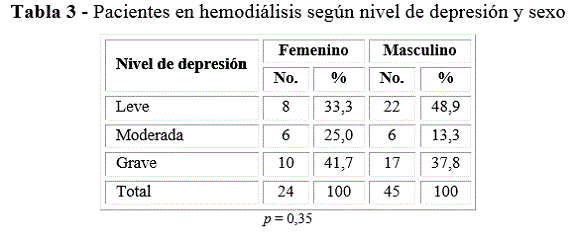Todos los pacientes bajo tratamiento de hemodiálisis presentaron algún nivel de depresión. De forma global el 43,5 % resultó tener depresión leve, el 39,1 % depresión grave y el 17,4 % moderada.