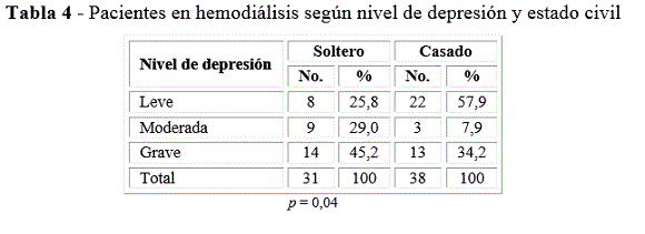En cuanto al estado civil (tabla 4) se puede apreciar que la frecuencia de depresión moderada resultó mucho mayor en los pacientes solteros (29 %), al ser comparados con los que son casados, que solo tuvieron el 7,9 % con depresión moderada. De igual forma, la frecuencia de depresión grave fue mayor en los pacientes solteros (45,2 %). Las diferencias comentadas en este caso sí resultaron ser estadísticamente significativas (p = 0,04).