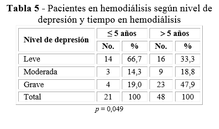 La frecuencia de depresión moderada en los pacientes con más de 5 años en el tratamiento (18,8 %), resultó mayor al ser comparada con la frecuencia de depresión moderada en los pacientes con 5 o menos años de tratamiento (14,3 %). Con respecto a la depresión grave, la frecuencia casi alcanzó la mitad de los pacientes que tenían más de 5 años de tratamiento (47,9 %) (tabla 5). Las diferencias en los niveles de depresión para esta variable, resultaron ser estadísticamente significativas (p = 0,049).