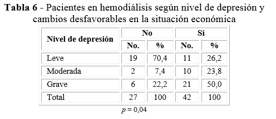 En relación con los cambios en la situación económica la frecuencia de depresión moderada resultó mucho mayor en los pacientes que sí tuvieron cambios en su situación económica (23,8 %), en comparación con la frecuencia de depresión moderada de los pacientes que no los tuvieron (7,4 %). La frecuencia de depresión grave fue mayor también en los pacientes que sí tuvieron cambios en su situación económica (50 %). Las diferencias en este caso también resultaron estadísticamente significativas (p = 0,04) (tabla 6).